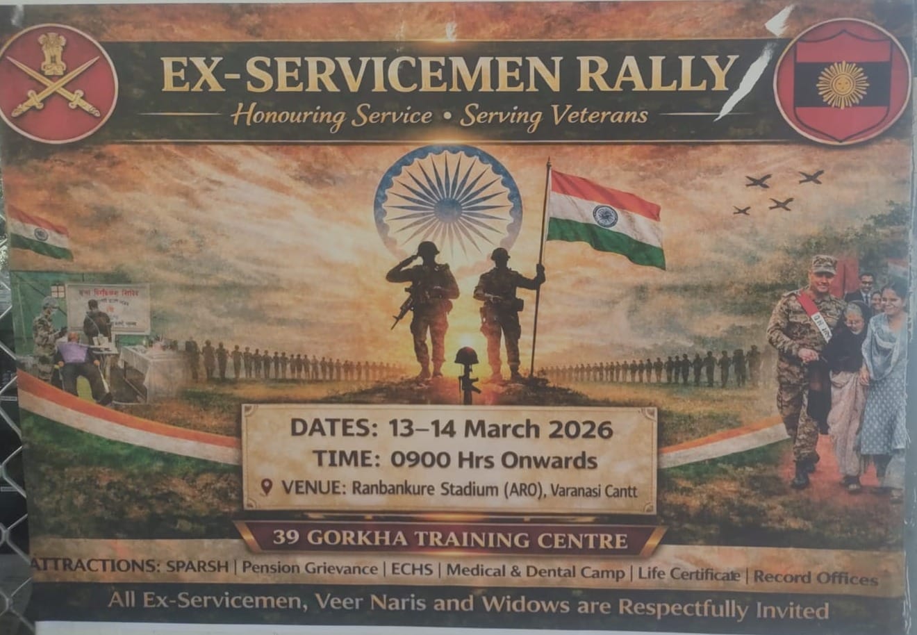 वाराणसी सैनिक छावनी के रणबांकुरे स्टेडियम में 13-14 मार्च 2026 को सुबह नौ बजे 'पूर्व सैनिक रैली' का आयोजन किया गया है, जहां 39 गोरखा रेजिमेंटल सेंटर द्वारा आयोजित रैली में वीर नारियों एवं पूर्व सैनिकों के प्रति कृतज्ञता व्यक्त की जाएगी. इसके साथ ही उनके राष्ट्र के प्रति समर्पण को याद किया जाएगा. इस आयोजन की अध्यक्षता स्टेशन हेडक्वार्टर वाराणसी के स्टेशन कमांडर करेंगे।